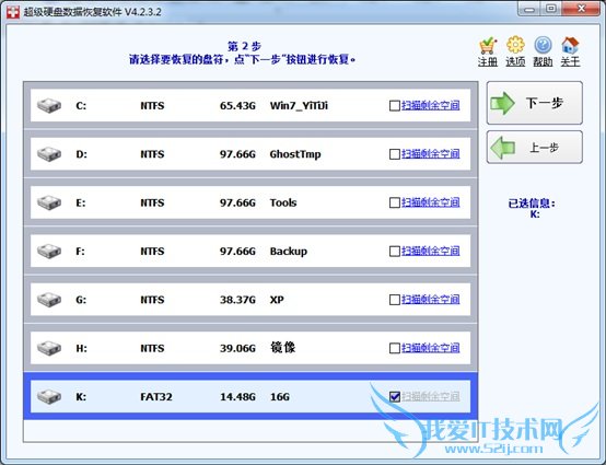 接下来是选择要扫描的盘符,这里的U盘盘符是 K:, 我们选上它,再点“下一步”按钮