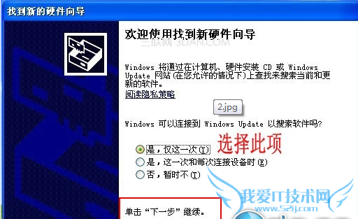 5.弹出新硬件安装窗口,我们来选择第一项,是,仅这一次,然后单击下一步继续