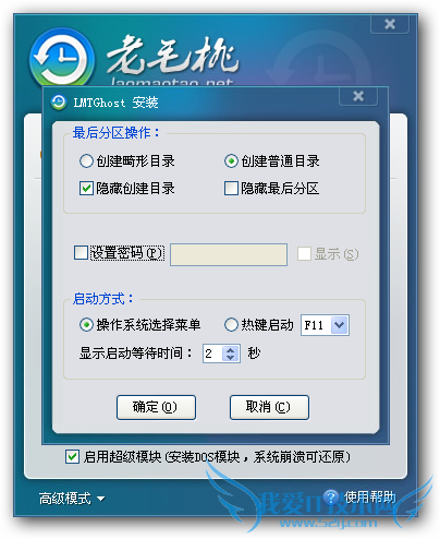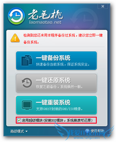 除了简便易操作的一键备份和还原功能,本程序还具有高级增强扩展功能,例如设置启动密码、创建防删除文件夹、隐藏备份分区、设置热键启动、重建主引导记录、一键重装系统等等。1、 启用超级模块,能在系统崩溃时DOS状态下恢复系统,建议启用。超级模块允许用户自定义系统备份文件夹的属性,可以创建普通文件夹或者畸形文件夹(图形界面下无法删除),为了系统备份的安全还可以隐藏备份文件夹或者隐藏系统备份文件所在分区。可以设置密码保护,防止别人误操作,热键启动的功能类似品牌机的一键恢复,可以自定义开机热键,电脑启动时按下即可立即进入老毛桃一键还原界面。