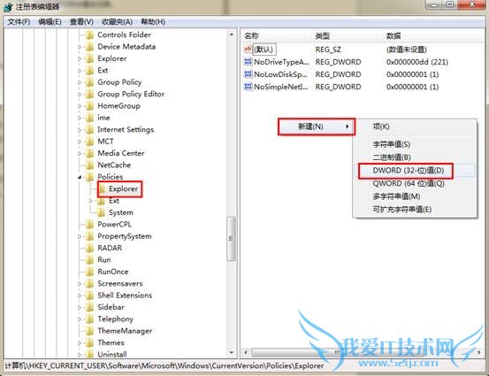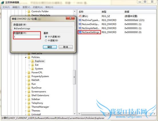 2、接着依次打开HKEY_CURRENT_USER→software→Microsoft→Windows→CurrentVersion→Policies→Explorer,然后在右侧空白处右键单击,新建一个DWORD值。并且命名为NoSaveSettings,接着双击打开,设置数值数据为1确定,重启电脑即可。如下图所示: