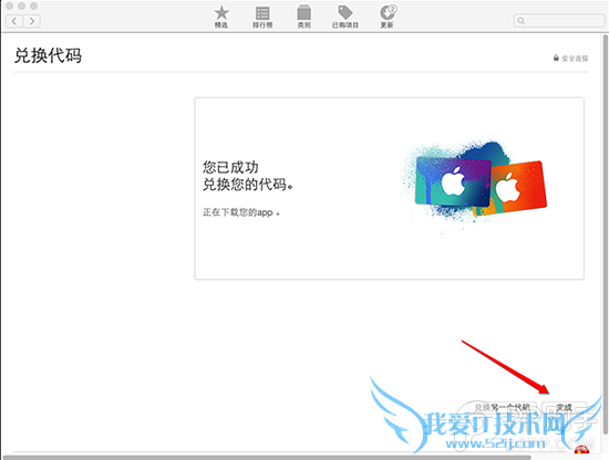 6、登录Apple ID 成功后,自动跳入兑换代码界面,这时候系统会自动输入刚刚显示的蓝色字体的兑换码,如果没有的话,我们可以自己手动输入。