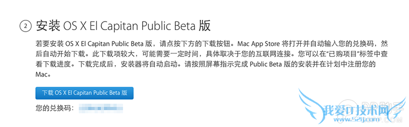 4、苹果会提示你先备份好现有系统的内容,尤其是重要文件资料,这里PC6苹果网小编再一次提醒各位Mac用户,工作用机不建议现在升级。我们在第2步可以看到蓝色按钮“下载OS X Yosemite Public Beta 版”,并且有一串蓝色 字体的兑换码,记住它。