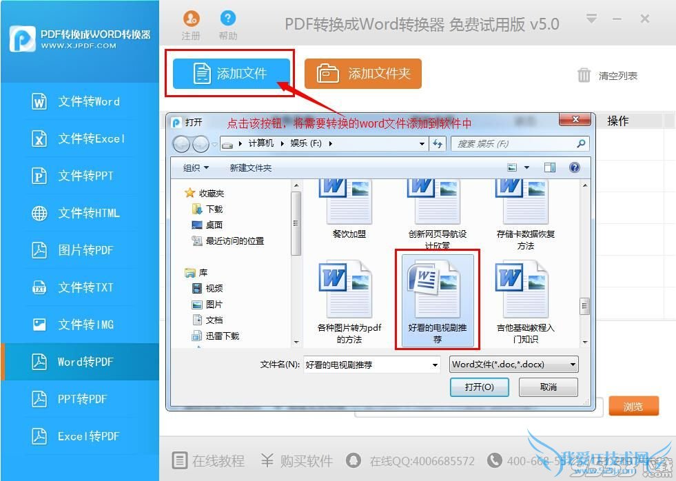 第3步,点击“添加文件”按钮,将需要转换的word文件添加到软件中。大家也可以使用鼠标将word文件拖拽到软件界面中进行文件添加。