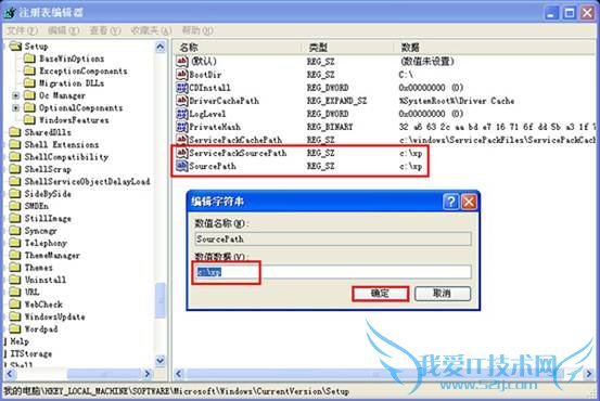 3、然后再分别双击ServicePack SourcePath 和SourcePath打开编辑字符串,在弹出的编辑字符串窗口中将数值数据设置为“C:XP”,再点击“确定”按钮,如下图所示: