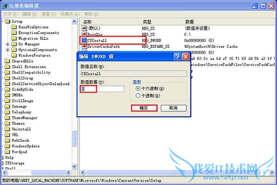 2、在注册表编辑器窗口中依次展开HKEY_LOCAL_MACHINESOFTWAREMicrosoftWindowsCurrentVersionSetup主键,在右边找到CDInstall并双击打开它的修改键值窗口,将其键值改为“0”再点击“确定”按钮即可,如下图所示: