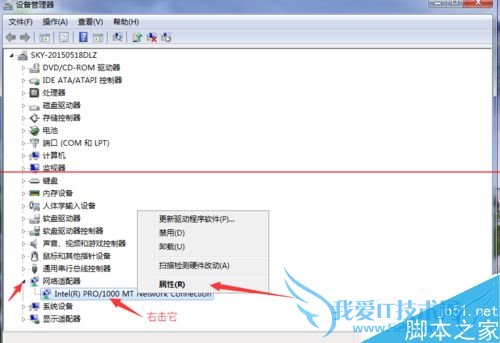 2、在设备管理器中,点击展开“网络适配器”一栏。选中想要修改的网卡,点击鼠标右键并选择“属性”选项。