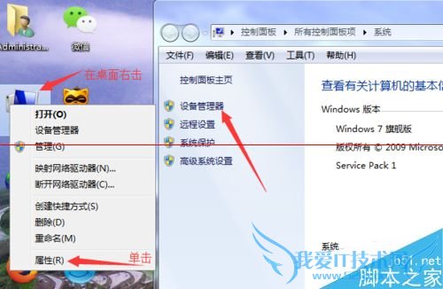 1、首先xp,win7,win8的原理都是一样的这里以 Windows 7 系统为例,在桌面选中“计算机”图标,点击鼠标右键选择“设备管理器”选项,如果没有“设备管理器”选项我们直接点击属性进入,如图所示