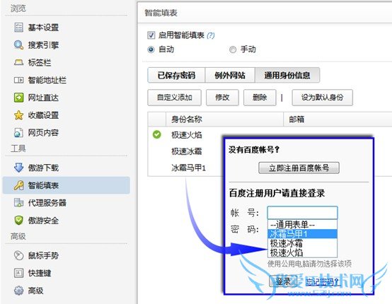 虽说网上“一人千面”,但更多时候大家都喜欢用统一的用户名。傲游智能填表的“通用身份信息”可以帮助用户保存最常用的用户名、密码,这样在使用不同的网站时就无需再重复填写。