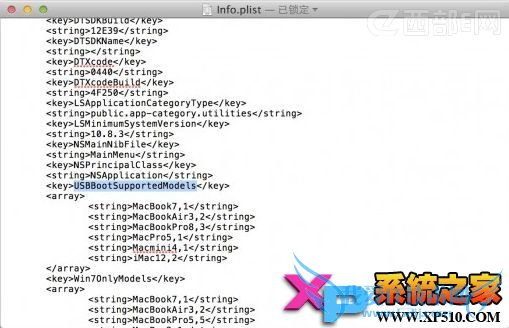 然后编辑桌面上的 Info.plist,可以用任意纯文本编辑器打开进行编辑,找到PreUSBBootSupportedModels,将其修改成 USBBootSupportedModels,其实也就是将前面的 Pre 去掉,然后保存之。