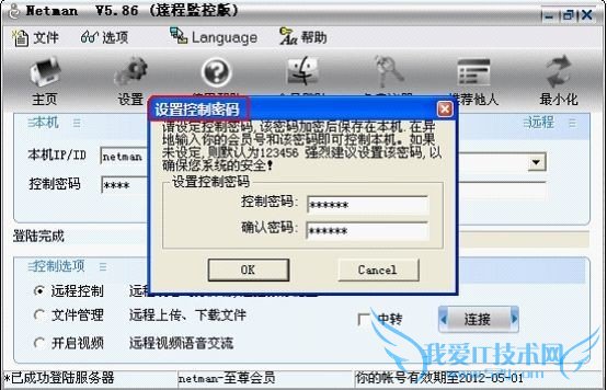 5.第一次使用会员登录时,会弹出“设置控制密码”选项,需要注意的是,这里修改的不是前面填写的“登录密码”,而是从其他电脑连接本电脑时需要输入的“控制密码”。很多用户会误以为这里是修改“登录密码”,导致第二次使用会员登录时,发现登录密码不正确。