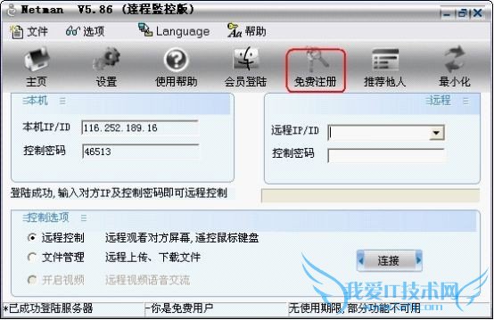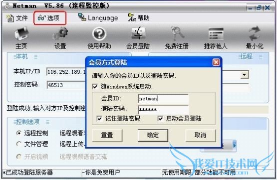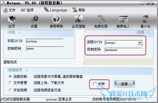 7.有同样的方法在另一台电脑安装Netman监控版并使用另一个会员登录,在“远程IP/ID”处输入对方的会员ID和控制密码,点击“连接”即可连接远程电脑。