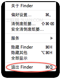接着,按照上面重启方法中任意一种对 Finder进程重启。这时候 Finder菜单里面就会出现“退出 Finder”的菜单项(快捷键为 Command + Q),如右图。 好了,开始动手试试吧!