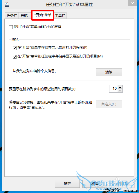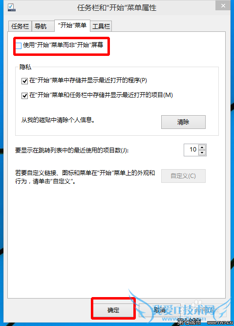 3、取消勾选【使用开始菜单而非开始屏幕】--确定