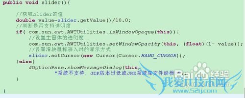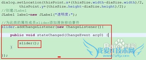 创建JLabel,添加slider滑块的滑动事件,并在事件中加入方法slider(),当然此方法需要新建,待会再新建,让我们先把setOpacity()方法中的代码添加完成。