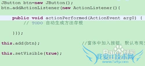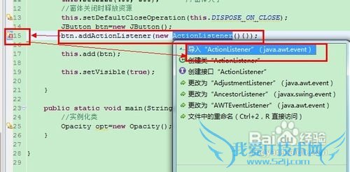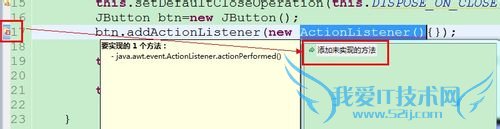 添加按钮BTN的ActionListenr()单击事件,在出现的错误中点击错误处,然后自动导入ActionListener类,但是仍然出现错误,用户需再次点击错误处以添加必要的方法实现。