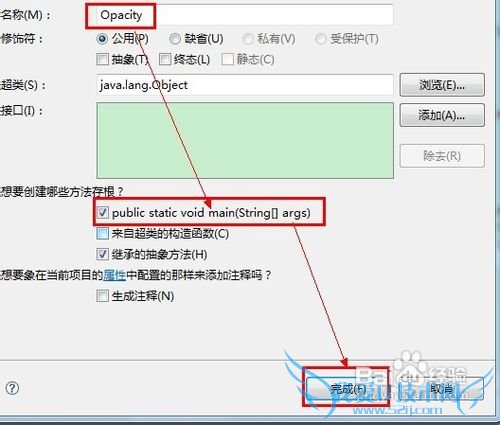 右击创建的项目,在右键列表中依次选择“新建”、“类”,在“新建类”窗体中输入自定义类名,勾选相应复选框,点击“完成”按钮完成类的创建。