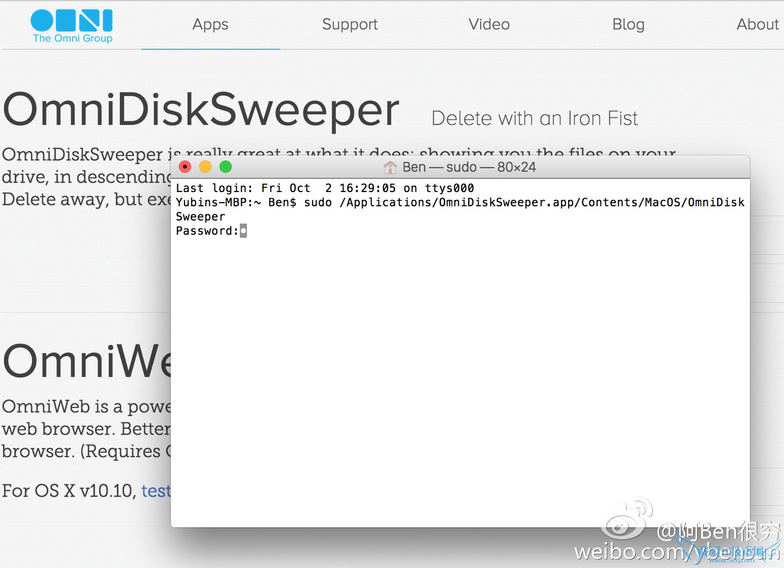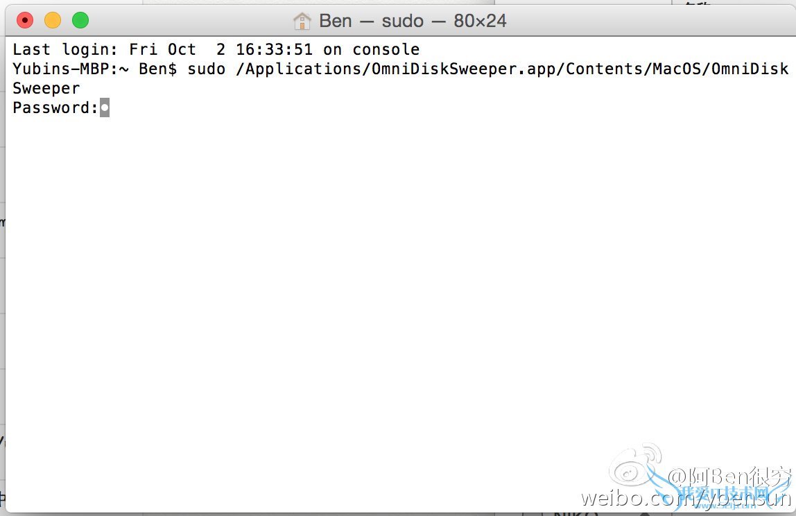 然后command+v把之前的路径打上,或者直接把这个OmniDiskSweeper这个文件拉到终端里面。然后输入你的密码,就是你电脑管理员密码。