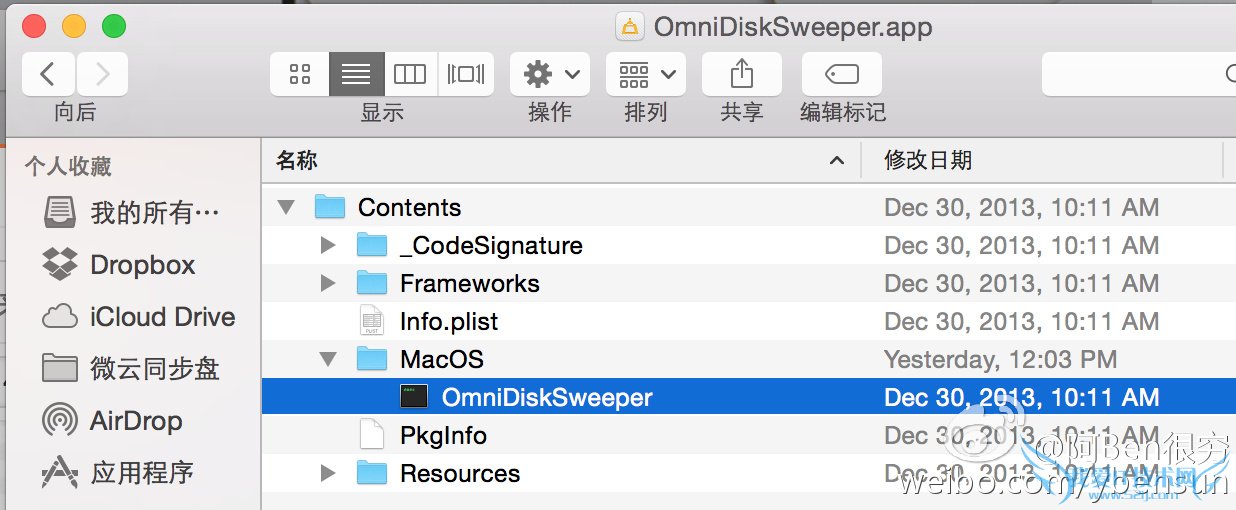 然后在Contents -> MacOs里面找到这个OmniDiskSweeper,这个时候按command+c获取OmniDiskSweeper的路径