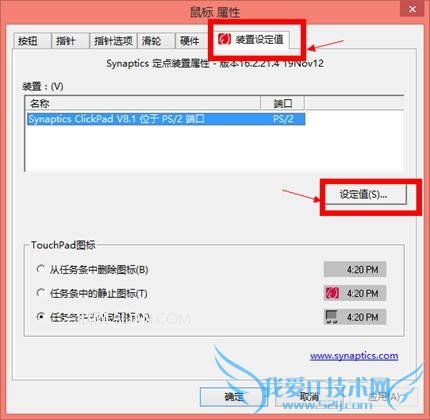 2. 打开鼠标属性,选择里面的装置设定值,然后点设定值,如图: