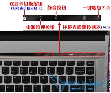 3、IdeaPad U460A笔记本电脑的双显卡切换开关的位置比较特殊,在电脑的键盘右上方位置,采用了触控按键的设计。