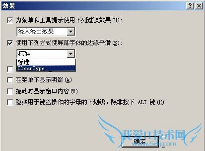 下面选中该设置对话框中的“使用下列方式使屏幕字体的边缘平滑”复选项,同时单击该选项下面的下拉按钮,从弹出的下拉列表中选中“ClearType” 项目,并单击一下“确定”按钮;之后再打开Word文档编辑窗口或网页浏览窗口,看看其中的文字字体显示效果是不是更平滑了一些!?