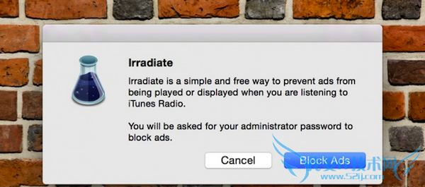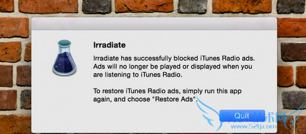 由于 Irradiate 是基于修改 hosts 文件,实现「屏蔽 iTunes Radio 广告服务器」效果的,所以受到 Mac App Store Sandbox 限制,开发者并未上架至 Mac App Store,读者需 前往官网 下载。Irradiate 的使用方法很简单,点击 Block Ads 就能立刻实现效果(上图);若要恢复,再次打开 Irradiate 并点击 Restore Ads 即可(下图)。