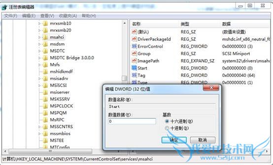 第二步、打开注册表编辑器之后,进入“HKEY_LOCAL_MACHINE/System/CurrentControlSet/Services/Msahci”键值。在右边窗口中双击名称为“Start”的项目,会弹出一个对话框,将默认的参数由3更改为0。点击“确定”并且保存之后,重新启动电脑。