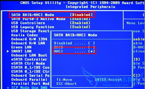 第三步、重启电脑之后,进入BIOS,在“Integrated Peripherals”页面中,将“SATA RAID/AHCI Mode”更改为“AHCI”(不同BIOS选项名称会有细微差别)。