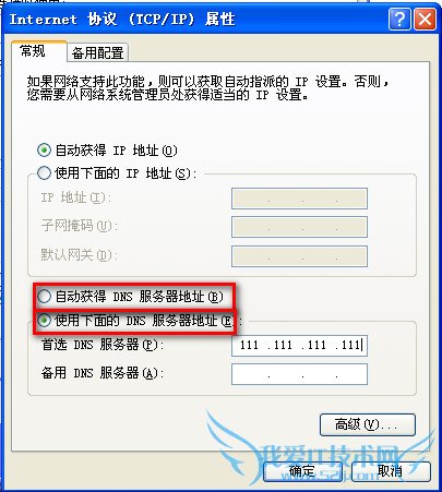 解决办法:可以找一个可用的DNS服务器IP地址,把这个111.111.111.111替换掉。或者试试自动获得DNS服务器地址,我这里用第二种办法,先自动去获取,点击“确定”。