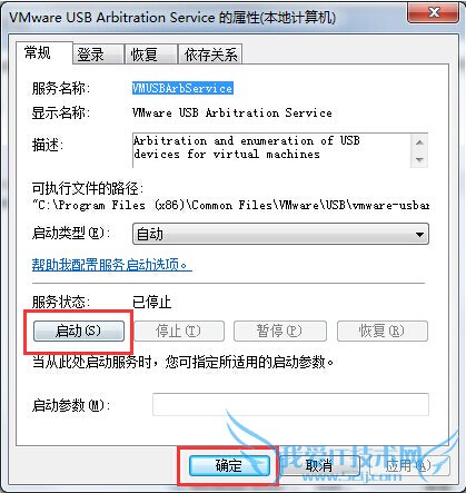 5.双击打开VMware USB Arbitration Service项,将窗口中的服务状态开启点击确定完成操作。如下图所示