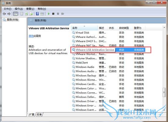 4.在打开的本地服务窗口中,找到VMware USB Arbitration Service。如下图所示
