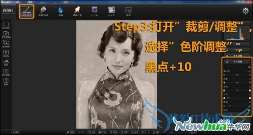 第三步,切换到“裁剪/调整”,选择“色阶调整”,黑点增加10。经过前面几步的处理,头发微微有些泛黄,黑点的调整,使头发的颜色更结自然。