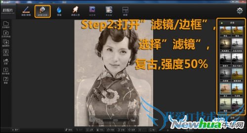 第二步,打开“滤镜/边框”,选择复古滤镜,强度为50%,使照片出现斑驳的痕迹。