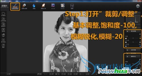 第一步,打开图片,选择“裁剪/调整”中的“基本调整”,将饱和度降低100,对整张照片进行去色。接着选择“模糊与锐化”,模糊降低20,使照片的线条更加柔美,画面的质感更加接近老照片。