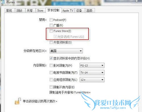 如果你使用上述方法后问题依旧,请尝试依次进入“iTunes→编辑→偏好设置→家长控制”,在这里先选择禁用iTunes Store(图3),保留“允许访问iTunes U”,确定后重启iTunes,再重复前面的操作并取消禁用iTunes Store,如此也能解决“发生未知错误-50”问题。
