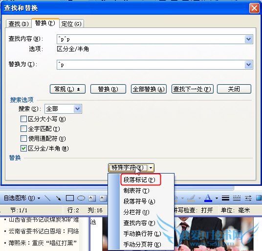¡¡¡¡×¢£º¶ÎÂä±ê¼ÇÒ²¿ÉÒÔÕâÑùÊäÈ룺´ò¿ª¡°²éÕÒºÍÌæ»»¡±¶Ô»°¿ò£¬µ¥»÷¡°¸ß¼¶(M)¡±°´Å¥£¬ÔÙ´Ó¡°ÌØÊâ×Ö·û¡±ÏÂÀÁбíÖÐѡȡ¡°¶ÎÂä±ê¼Ç¡±¡£