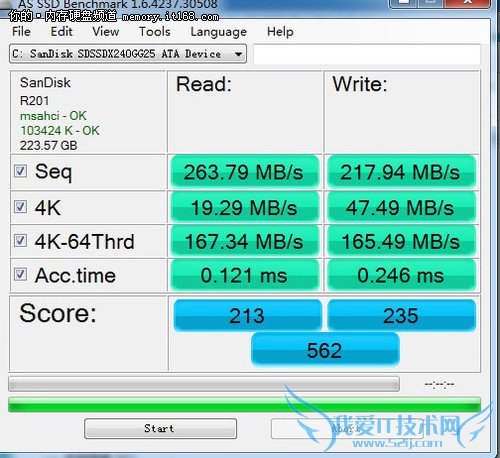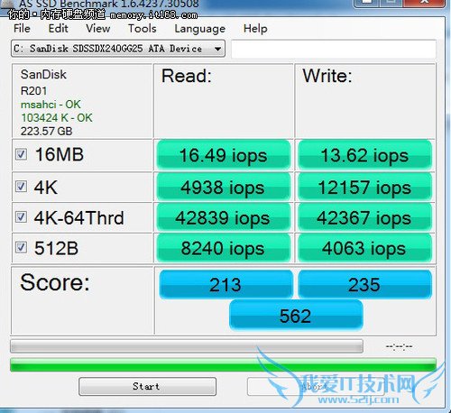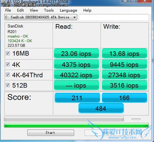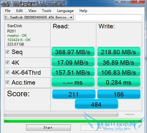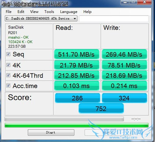 在AS SSD测试中,闪迪至尊极速系列240GB固态硬盘运用原生SATA3.0接口在连续读取和写入方面达到了511.70MB/s和269.46MB/s。它的4K多线程读取速度为212.85MB/秒,写入速度为218.69MB/秒。而单单顺序读取方面原生SATA3.0接口就比SATA2.0接口方面多了近一倍。