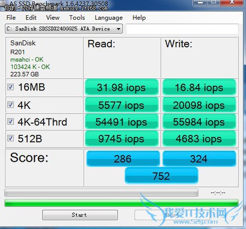 在4KB文件存取方面,闪迪至尊极速系列240GB固态硬盘运用原生SATA3.0接口的随机读取IOPS值为5577,而随机写入为20098。其多线程读取/写入4KB文件的IOPS值为54491和55984,总分为752分。虽然这里的跑分,在有些数据方面SATA2.0比桥接SATA3.0方面要高,但是不可否认的是使用原生SATA3.0固态硬盘的性能提升特别明显。