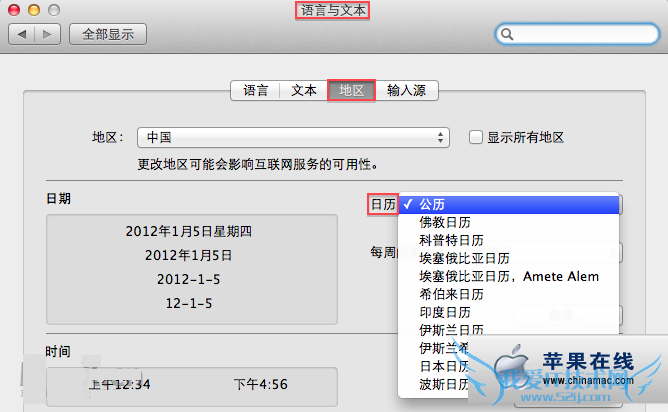 Mac内置了多种历法,方便人们的使用,如果你想在Mac中使用佛教日历,伊斯兰日历,印度日历,波斯日历...按照以下方式操作:打开“系统偏好设置”,点击“语言与文本→地区”,然后点击“日历”选项框,选择对应的日历即可。如下图