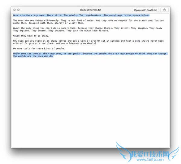 欢迎您访问我爱IT技术网,今天小编为你分享的电脑教程是日常使用电脑方面的电脑常识:苹果Mac如何在快速查看中选择文字,学会并运用这些电脑常识,让你快速玩转电脑及互联网方面的知识,下面是详细的分享!