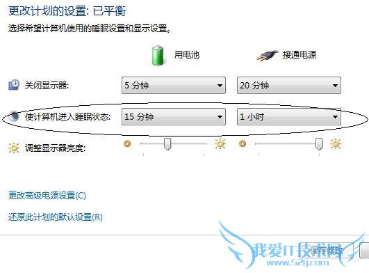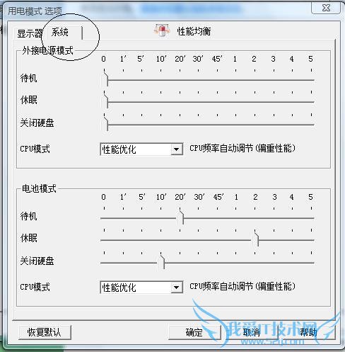 在这里面可以分别调节外接电源模式和电池模式下的待机和休眠时间,调整游标为0时,表示从不自动待机或休眠,也可以调整更改为我们希望的时间值。