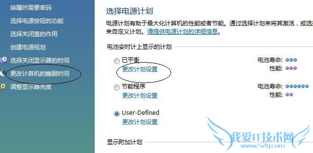 在左侧任务窗格中选择“更改计算机的睡眠时间”,或选择右侧画圈处的更改计划设置,此时会打开“更改计划的设置:已平衡”窗口