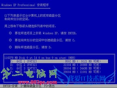 这里用“向下或向上”方向键选择安装系统所用的分区,如果你已格式化C盘请选择C分区,选择好分区后按“Enter”键回车,出现下图4所示