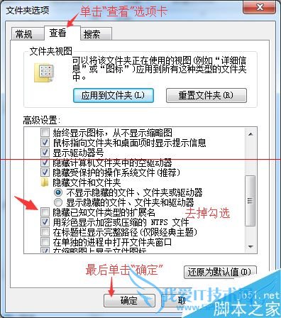 5、单击“查看”>>>去掉“隐藏已知文件的扩展名”的勾选>>>“确定”