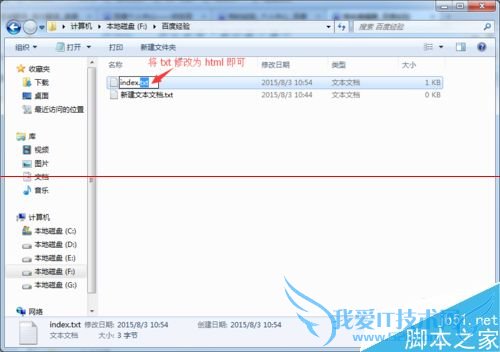3、重命名刚才创建的命名为index的文本文件,将后缀名txt修改为html,如果系统默认隐藏了显示后缀名,可以按照步骤4和步骤5执行
