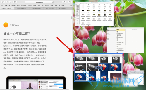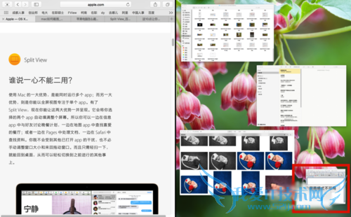 5、支持Split View分屏功能的应用,鼠标移动上后,会出现蓝色的框,点击后,就完成了两个应用的分屏