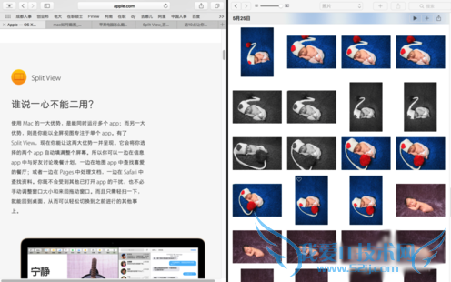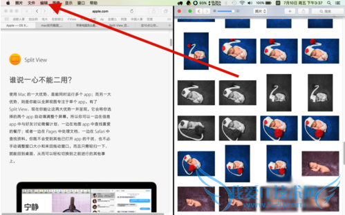 2、而要看到右侧照片应用的顶部菜单,就需要先点击右侧软件的任意位置,在移动鼠标到左侧顶部,稍微麻烦了些,但想想Split View分屏功能带来的好处,也就忍了。