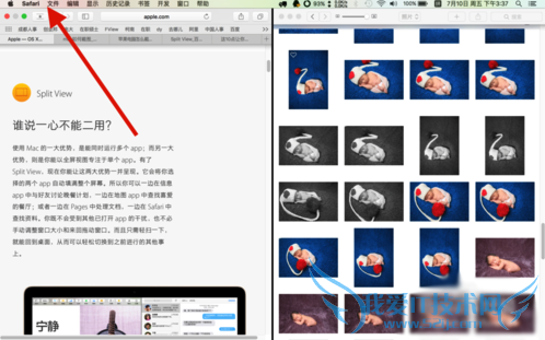 1、Mac系统的所有应用菜单栏都是在系统左上角,不跟随软件,所以Split View分屏功能开启时,顶部只能看到一个软件的顶部菜单。现在我们鼠标点击左侧Safari任意位置,鼠标再移动到左上角,顶部会出现Safari顶部选项菜单。