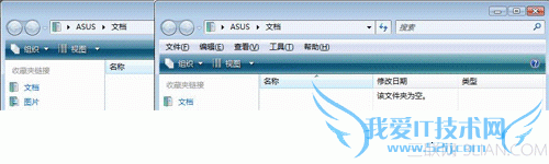 V ista和XP风格文件夹比较(图注:Vista的文件夹窗口没有了菜单项,虽然漂亮了,但是不一定方便。)