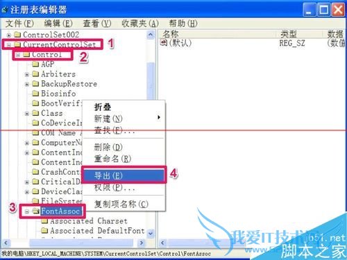 2,按HKEY_LOCAL_MACHINESYSTEMCurrentControlSetControlFontAssoc此路径定位于FontAssoc项,右键,选择菜单中的“导出”。